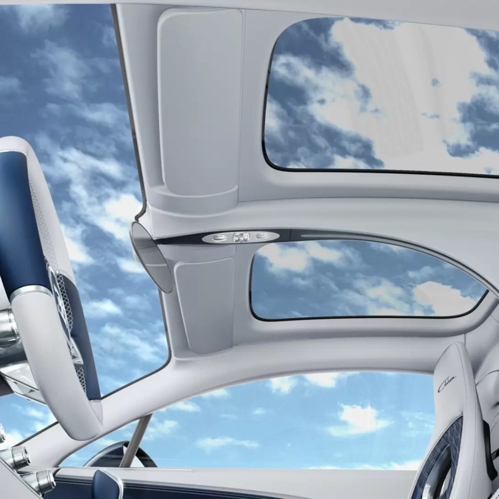 The Skyview option was developed in accordance with the attributes that characterize the CHIRON. The symbolic horseshoe grill, and the distinctive C-bar on the side, still define it as unmistakably BUGATTI, as do its pronounced lines and generous surfaces. From inside, the glass roof enables a view into another dimension, flooding the cockpit with natural light.
