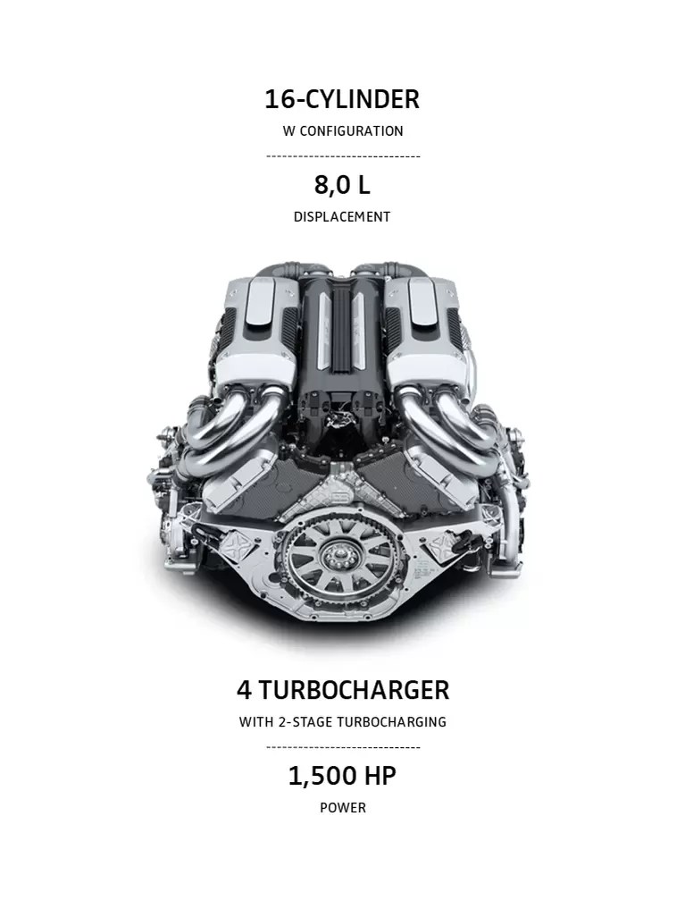 The heart of the CHIRON is its quad-turbocharged 8 l W16 engine. This unique masterpiece generates an incredible 1,500 hp and 1,600 Nm of torque, with an almost linear power output between 2,000 and 6,000 rpm. Four high-performing turbochargers work in a two-stage controlled configuration, and define this champion of performance. A remarkable 60,000 liters of air are pumped through the engine every minute.